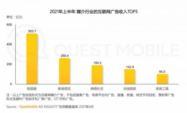 根据AD insight 2021年6月发布广告洞察数据库显示,短视频投放今年上半年超503.7亿元,差不多接近新闻资讯、社交、在线视频、工具类广告投放总和了。