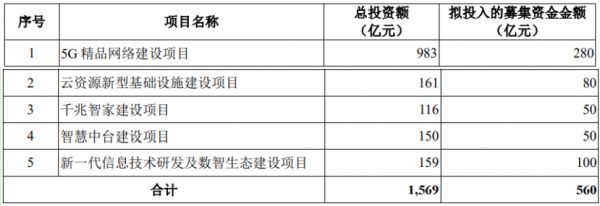 招股书(申报稿)显示,中国移动拟公开发行A股数量不超过9.65亿股,不超过本次发行后公司已发行股份总数的4.5%(行使超额配售选择权之前),拟募集资金560亿元,用于投资“5G精品网络建设项目”、“云资源新型基础设施建设项目”、“千兆智能家建设项目”、“智慧中台建设项目”、“新一代信息技术研发及数智生态建设项目”。其中,5G项目为投资重心,拟投入280亿元,占总募资额的50%。