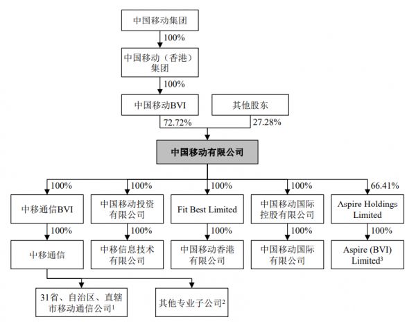 从公司股权架构来看,截至目前,公司控股股东为中国移动BVI,其直接持有中国移动72.72%的股份,中国移动集团通过其全资子公司中国移动(香港)集团持有中国移动BVI100%股份,为中国移动实际控制人,中国移动集团则由国资委100%持股。