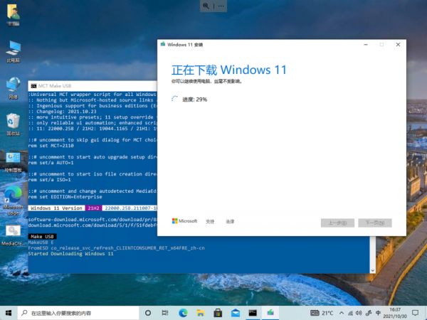 选择完成之后,脚本自动下载 Windows 11 媒体创建工具并开始下载 Windows 11 安装镜像,这里和我们一般下载运行 Windows 11 媒体创建工具步骤基本类似。