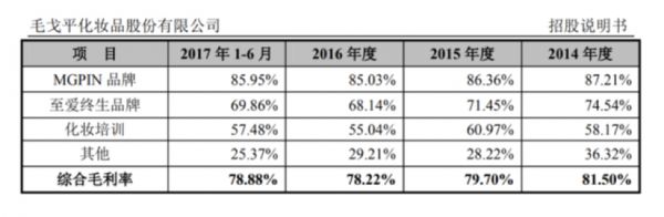 根据招股书,毛戈平的主要收入来源于两个彩妆品牌(MGPIN及至爱终生)和化妆学校的培训业务。根据证监会上截止于2017年9月的招股书,在2014至2017年上半年,毛戈平实现营收分别为2.80、3.21、3.43和2.01亿元。同期归母净利润分别为4711.26、5462.47、5331.97和3561.97万元。