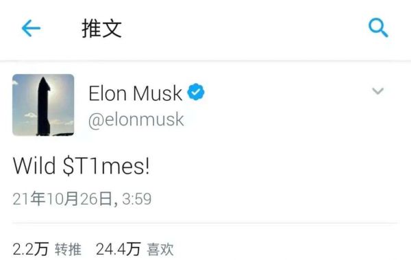 马斯克在Twitter上庆祝了这一里程碑时刻,一语双关写道:“Wild $T1mes!”。