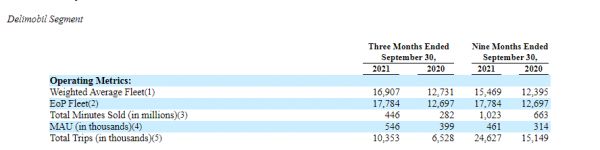 Delimobil 的汽车共享车队采用自由浮动的共享模式,主要由经济车辆组成,包括大众 Polo、菲亚特、现代 Solaris、雷诺 Kaptur 和起亚 Rio等。Anytime Prime 的长期租赁车队则由高级和豪华车辆组成,包括奔驰,宝马和保时捷等。截至2021年9月30日,Delimobil 的汽车共享车队在俄罗斯 11 个城市拥有近 18,000 辆汽车,Anytime Prime的长期汽车租赁车队由近600辆汽车组成。