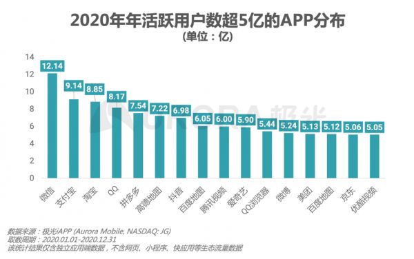 微信(12.14亿)、支付宝(9.14亿)、淘宝(8.85亿)、QQ(8.17亿)、拼多多(7.54亿)、高德地图(7.22亿)、抖音(6.98亿)、百度地图(6.05亿)、腾讯视频(6亿)、爱奇艺(5.9亿)、QQ浏览器(5.44亿)、微博(5.24亿)、美团(5.13亿)、百度(5.12亿)、京东(5.06亿)、优酷视频(5.05亿)