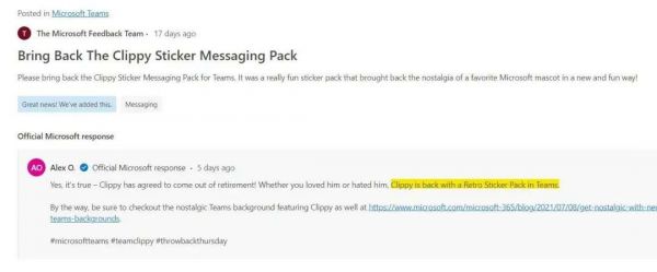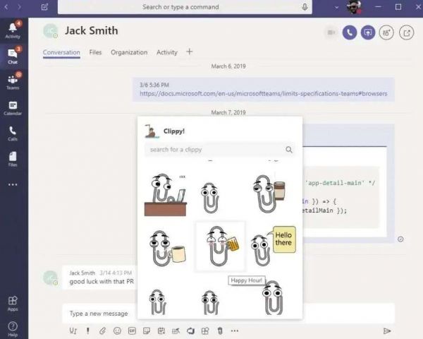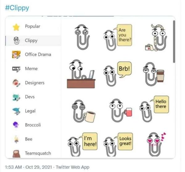 2019 年 3 月,Clippy 首次作为表情包贴纸出现在了 Microsoft Teams 之中。微软的开发人员还在 Github 上公布了这些表情包贴纸的代码,欢迎所有 Microsoft Teams 用户免费导入和使用它们。