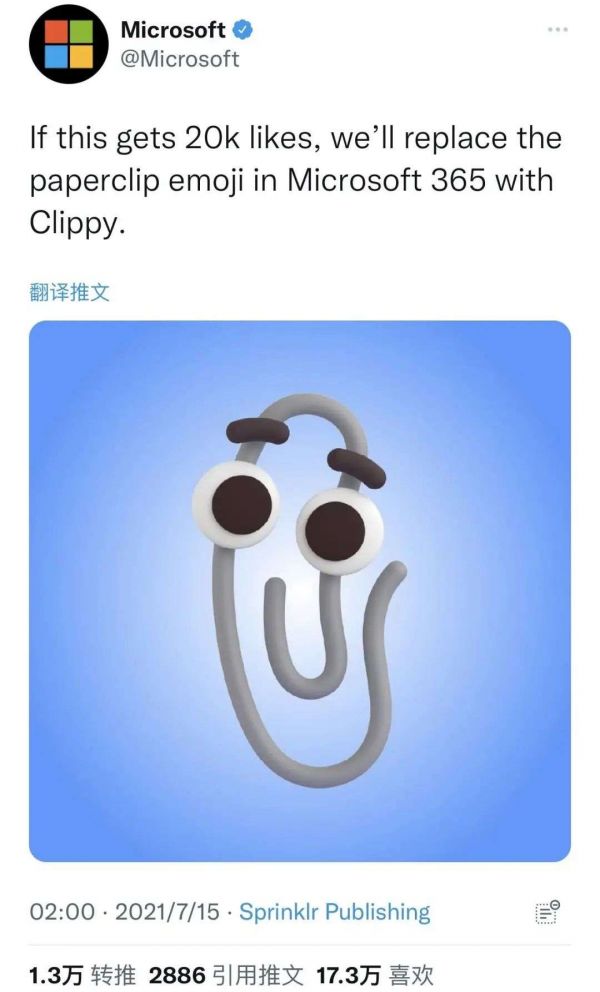 不过,Clippy 总算被微软再次重视了。今年 7 月,微软在官方推特发文:「如果这条推文能得到 2 万个赞,我们就用 Clippy 替换掉 Microsoft 365 中的回形针表情符号。」