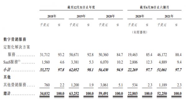 从收入情况看,其中绝大部分收入来自数字营销服务,数字营销服务收入分别占同期收入总额的97.8%、98.1%与94.9%。从细分的数字营销服务来看,定制化解决方案2020年占比84.7%,SaaS服务占比10%。