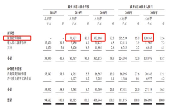 2019年至2021年上半年,“魔胴防弹咖啡”的销售额分别为0.72亿元、3.33亿元、1.2亿元,分别占总收入的83.0%、72.8%及72.4%,毛利分别占总毛利的90.3%、101.6%、及81.3%。