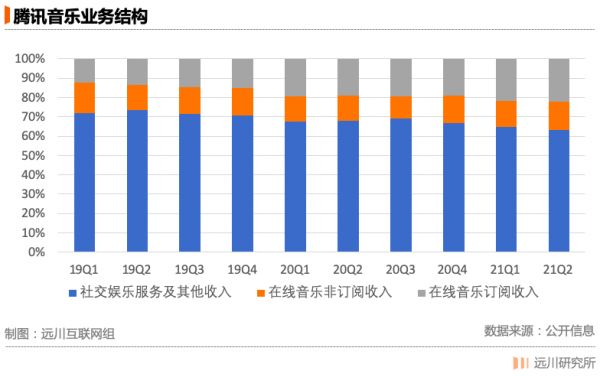 腾讯音乐的业务分为在线音乐业务和社交娱乐业务,前者又可以分为订阅业务(会员付费收入)和非订阅业务(版权转授、广告、数字专辑收入)。在腾讯音乐的业务里,依托全民K歌和直播的社交娱乐业务才是营收的大头,占比在六到七成。