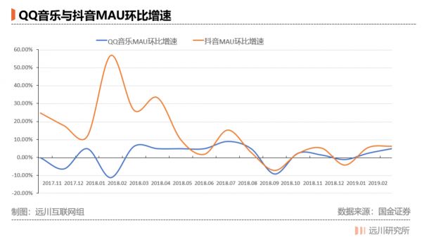 国金证券统计的数据显示:2018年4月开始,QQ音乐抖音MAU环比的增长趋于同步,2018年9月以后,随着抖音和QQ音乐的用户基数达到同一量级,两者的MAU增长曲线高度一致,可谓相辅相成[4]。