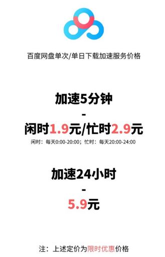 同年10月23日,百度网盘官方公布了单次或单日的下载加速服务费用,限时优惠为:加速5分钟,闲时(每天0:00-20:00)需支付1.9元;忙时(每天20:00-24:00)需支付2.9元;加速24小时,需要支付5.9元。