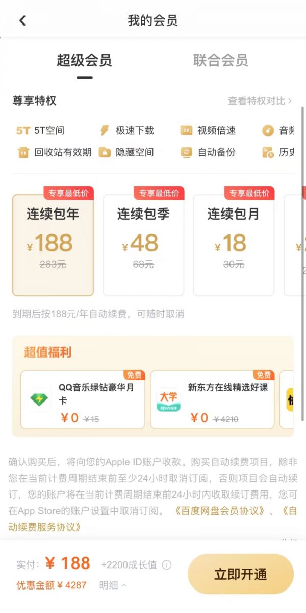 若选择连续付费的模式,包年、包季、包月的费用分别为263元、68元、30元,专享最低价为188元、48元、18元,用户通过付费可以享受5T空间、极速下载、倍速、高清画质、在线解压等功能。