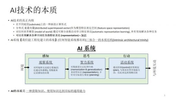 这是非常重要的一点,有了这两者定义之后,很自然地我们可以把AI的本质定义成为是一种获取知识,运用知识达到目标的通用能力。