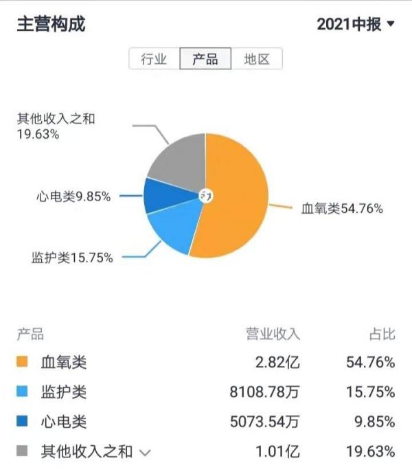 具体主营构成方面,据中报数据,截至今年6月底,康泰医学血氧类的营收占比约为55%,监护类的营收占比约为16%,心电类的营收占比约为10%,剩下20%则来自超声类、血压类及分析测试等收入。