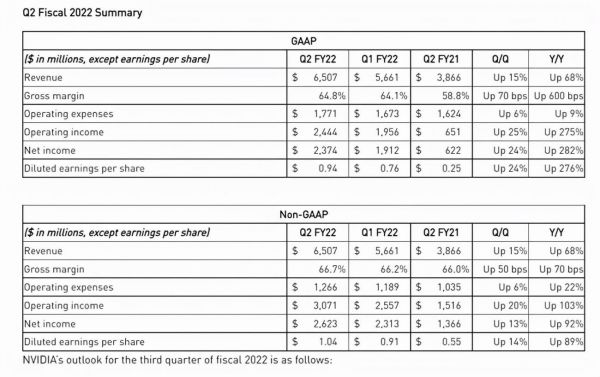 从核心数据来看,二财季英伟达营收为65.07亿美元,与上年同期的38.66亿美元相比增长68%,与上一财季的56.61亿美元相比增长15%;净利润为23.74亿美元,与上年同期的6.22亿美元相比增长282%,与上一财季的19.12亿美元相比增长24%;不按照美国通用会计准则的净利润为26.23亿美元,与上年同期的13.66亿美元相比增长92%,与上一财季的23.13亿美元相比增长13%。