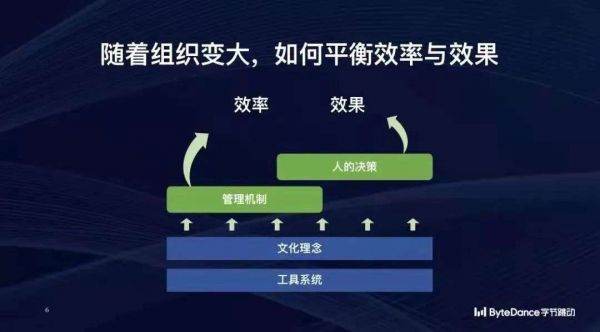 字节一直在学习先进的管理组织模式,例如奈飞的 Context not Control(充分的信息共享而非控制),谷歌的 OKR 机制与 CEO 面对面,Facebook 的用户增长和工程师文化,以及亚马逊的 Always Day One(始终创业)。