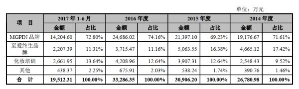 此外,毛戈平旗下还有一个定位于二三线城市女性消费者的品牌“至爱终生”,2014年至2017年上半年,该品牌的营收分别为4665万元、5063万元、3715万元和2207万元,在总营收中的占比最高时也仅为17.42%。