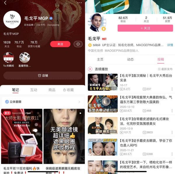 即使是近年在新兴内容平台上做营销,毛戈平仍然遵循这一思路。2020年5月,毛戈平个人入驻B站,截止目前已发布11条视频内容,共收获了超过82万粉丝。在营销策略上,毛戈平走了一条与其他品牌不相同的道路。