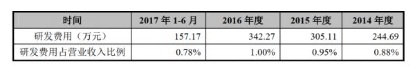 通过招股书,问题清晰地摆在了眼前。研发费用率低,公司研发人员的数量也很少,截止2017年6月,在总计1321名员工中,研发人员仅有15人,占总员工的比重为1.14%。