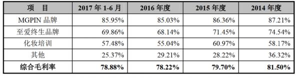 若细分不同产品线,高端的MGPIN品牌在其中作出了主要的贡献,从2014年开始,毛利率分别为87.21%、86.36%、85.03%和85.95%。