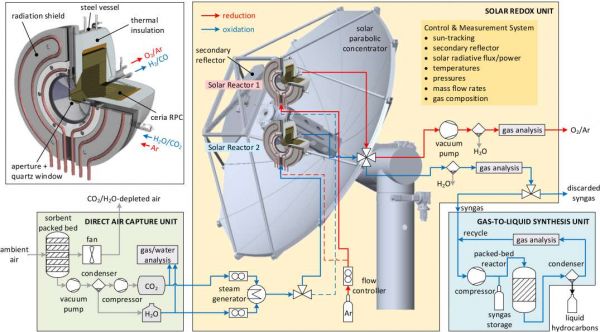而且,这个系统可以利用阳光和空气直接生产出液态烃或甲醇燃料,也就是所谓的“空气燃料”。