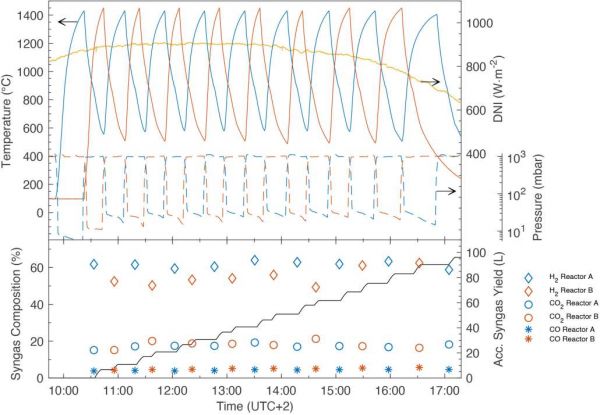 太阳能氧化还原装置中心的循环包括两个步骤:在第一吸热步骤中,二氧化铈热还原生成氧气,在第二放热步骤中,还原的氧化铈用二氧化碳/水分子重新氧化,分别生成一氧化碳或氢气。燃料(氢气、一氧化碳)和氧气分别在单独步骤中生成,从而避免形成爆炸性混合物,无需高温气体分离,研究人员采用温度和压力波动来最大化氧化铈的氧交换能力,从而提高每循环的燃料产量。
