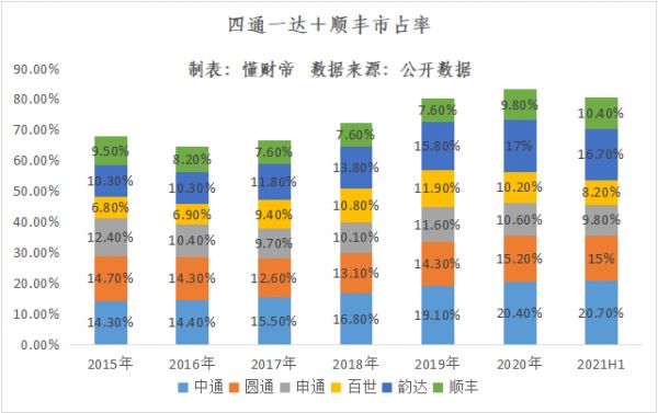 顺丰先抑后扬,其2021H1市场份额达到10.4%,较2019年增长了2.8个百分点。