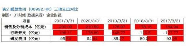 回翻联想集团财报可以发现,过去五个财年里公司销售、行政和研发三大支出成本,从2017财年的近乎3:2:1,来到了2021财年的2:2:1,其中涨幅最快的是行政开支,这一项中通常包含着高管薪酬、员工福利等。