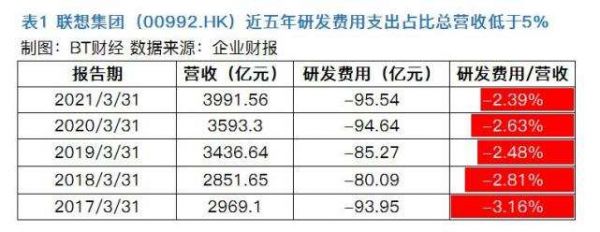 如果以联想财报来计算,过去五个财年间,公司研发支出占比营收从3.16%下降至2.81%、2.48%、2.63%和2.39%,没有达到上述5%的标尺。