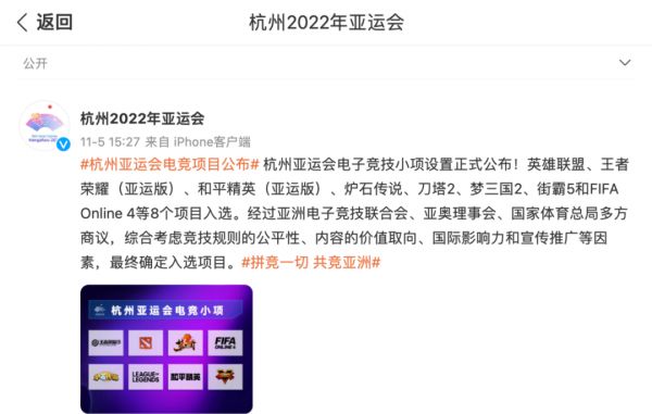 就在11月5日,杭州亚组委正式对外公布第19届亚运会电子竞技项目最终确认的八个小项项目,它们分别是《英雄联盟》、《王者荣耀亚运版本》、《和平精英亚运版本》、《FIFA Online 4》、《炉石传说》、《街霸 5》、《梦三国 2》与《DOTA 2》,同时,AESF-机甲大师和AESF-VR虚拟科技体育将作为示范表演项目进入杭州亚运会。