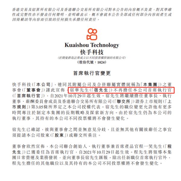 令人惊讶的是,上市还未满一年,快手就迎来了重大人事调整。10月29日晚,快手科技发布公告称,董事会已同意公司联合创始人宿华辞去首席执行官(CEO)一职,并已批准联合创始人程一笑担任该职务,自2021年10月29日起生效。