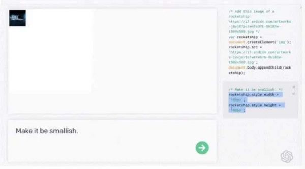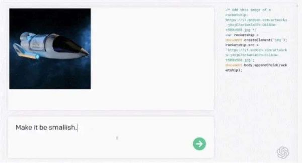 在官方示例的Codex效果展示中,程序员只需要在编辑界面写下“Make it be smallish”示例上图中的大型飞船就会如下图一般缩小,而在这个过程中程序员并不需要输入一行代码,Codex会自动编写车程序。