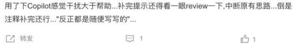 也有网友表示“Copilot 一时爽,调试火葬场”,因为想要清楚、清晰的描述出目标函数想要实现的功能并不简单,同时在使用Copilot的过程中,需要不断去回顾检查AI生成的代码是否正确,这反而容易干扰到编程时的原有思路。