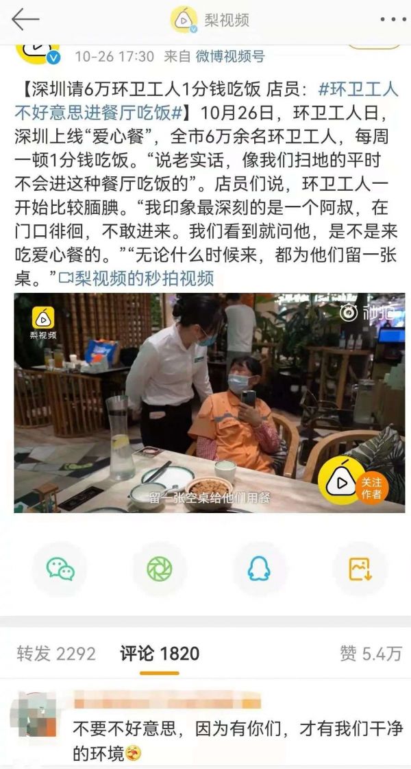 最近,深圳“环卫工人不好意思进餐厅吃饭”的话题上了热搜。一位环卫工人在一段视频中表示,“像我们扫地的,平时是不会进这种餐厅吃饭的。”网友们纷纷在话题下评论,“没有什么不好意思的,没有你们这些默默付出的人,哪里来的干净美好的城市”。