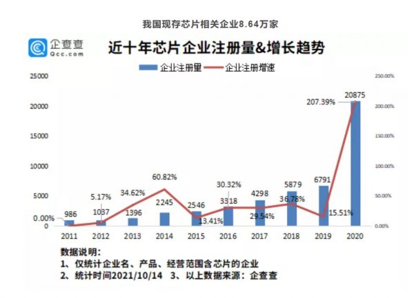 最近,来自企查查的一份统计数据显示,我国现存芯片相关企业8.64万家(这些企业涉及泛电子半导体产业链,有的聚焦在上游的芯片设计、制造和封测等,有的则聚焦在下游的电子系统业务)。2020年我国新增芯片相关企业2.09万家,同比增长207.39%,是近十年新增最多的一年,也是最快的一年,远远超过其他年份。2021年前9个月,我国新增芯片相关企业3.21万家,同比增长153.39%。