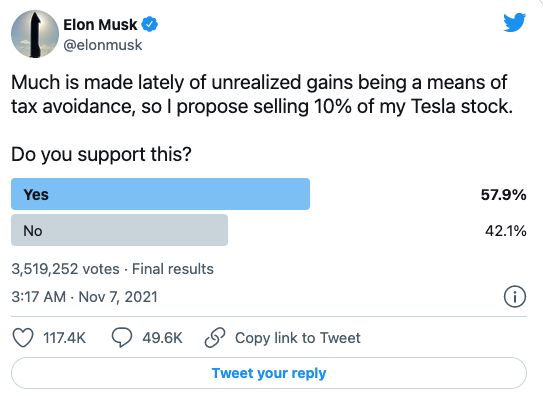 周日,近六成网友在Twitter上支持马斯克出售10%的特斯拉股份。马斯克表示,他将遵守投票结果。马斯克此前称,他出售这些股份来纳税,以防止被别人说自己在避税。