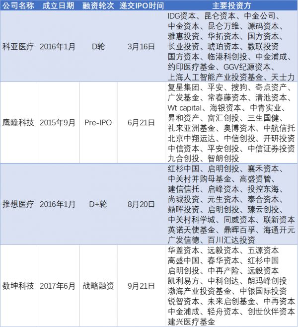 这些AI医疗公司背后也都是一众明星资本的加持,以申请上市的四家AI影像公司为例:科亚医疗背后有IDG资本、昆仑资本、中金公司等;鹰瞳科技则获得了复星、平安、搜狗等机构的支持;推想医疗的主要支持者包括红杉中国、启明创投、襄禾资本等;数坤科技的大股东有华盖资本、远毅资本、五源资本等。