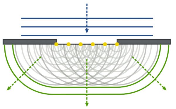 惠更斯原理示意图。波遇到障碍物时会发生衍射。这些光波会像水波一样互相叠加,这就发生了光的弯曲和散射。| Wiki