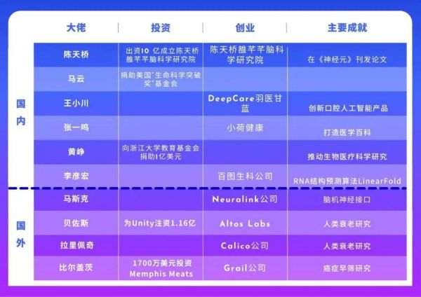 这和很多大佬在“退役”后的职业选择殊途同归。在国内,马云、李彦宏、张一鸣、黄峥等一众“顶流”,都曾表现出对生命科学的狂热,其中不乏功成名就后投身生命科学,继续发光发热的大佬: 今年7月,张一鸣卸任字节跳动CEO,表示要去探索生命科学;更早之前,黄峥也表示要致力于食品科学和生命科学领域的研究。