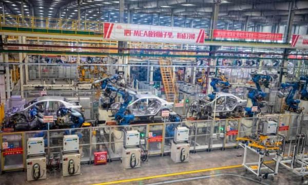 位于陕西西安的比亚迪工厂用来组装电动汽车的生产线。中国要求汽车制造商负责回收电池,目前中国回收的锂离子电池超过了世界其他国家的总和。图片来源:The Guardian