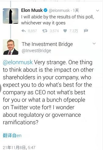 11月7日凌晨3点17分,特斯拉CEO马斯克在Twitter发起了一项24小时的投票意见征询,表示:“最近有很多人认为未实现收益是一种避税手段,所以我建议出售10%的特斯拉股票。你们是否支持这项提议?”