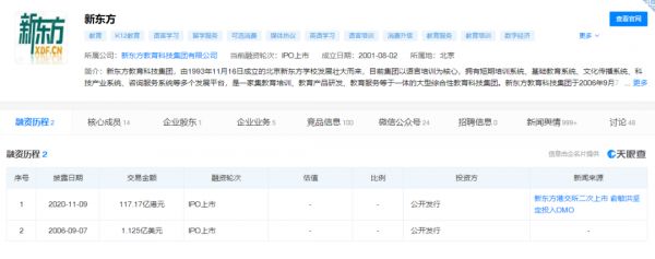 这一点也体现在新东方的IPO历程上。天眼查显示,与一众在线教育机构在上市前就大手笔融资不同,新东方迄今为止的唯二两次融资经历,即是在美股和港股的两次上市。
