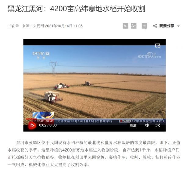 黑河水稻相关新闻。图/央视网截图