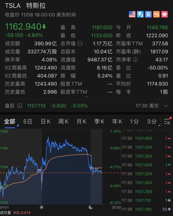 美股周一,特斯拉股价盘前一度大跌逾7%,截至收盘,跌幅缩小,特斯拉股价收跌4.84%,创6月初以来最大单日跌幅,报1162.94美元,最新市值为1.17万亿,较昨日跌去593亿美元,约合人民币3789亿元。