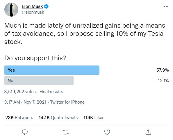 北京时间11月7日,特斯拉CEO埃隆·马斯克在推特上发起一项投票,询问网友是否支持自己卖掉手中价值超过200亿美元(约占马斯克持股的10%)的特斯拉股票并纳税。