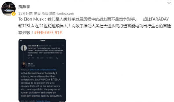 11月7日,贾跃亭在个人微博发文称,“To Elon Musk:我们是人类科学发展历程中的战友而不是竞争对手。一起让FARADAY和TESLA 在21世纪继续伟大!向敢于推动人类社会进步而打造智能电动出行生态的冒险家致敬!”