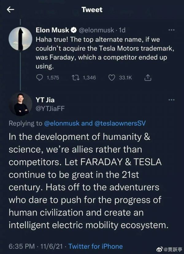 在发文的同时,贾跃亭还配了一幅马斯克推文截图,马斯克在该推文中承认贾跃亭创办的法拉第未来是竞争对手,马斯克称,特斯拉在获得“特斯拉”商标之前,还曾将“法拉第”作为首个备选名字,最后被竞争对手选用了。贾跃亭回复了马斯克的这条推文,内容与微博内容一致称和马斯克是“战友而不是竞争对手”。