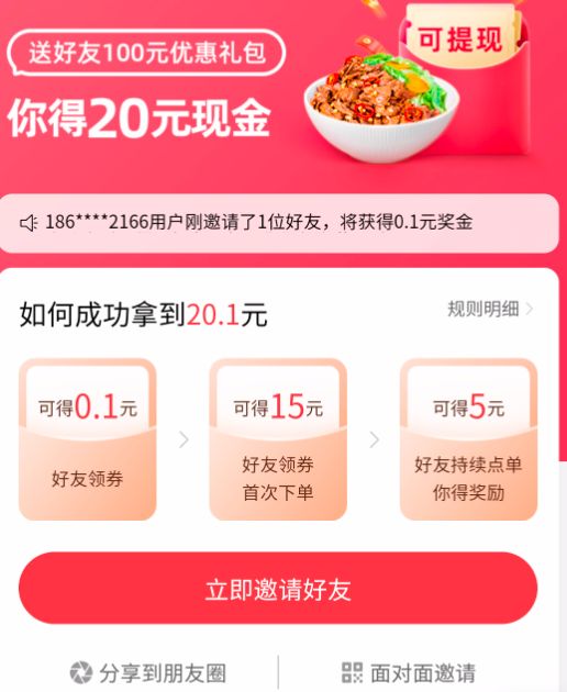 处于起步初期的嗷嗷吃饭,通过大力度优惠获客。据一位体验过该业务的用户向Tech星球表示,嗷嗷吃饭的价格非常便宜,可在原价的基础上打5折,几元即可点到一份外卖,且饭菜质量不低。此外,嗷嗷吃饭平台还推出了邀请好友活动,通过社交去驱动获客能力,只要用户成功将活动界面分享到朋友圈或面对面邀请,双方都能获得相应的奖励。
