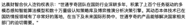目前,世通亨奇已率先在行业门槛最高的国家安全领域实现商业落地,完成近亿元订单,今年订单量同比增长400%。此外,公司在政府部门的海外风险评估、违法违规监管、文旅和应急管理等领域也实现落地。