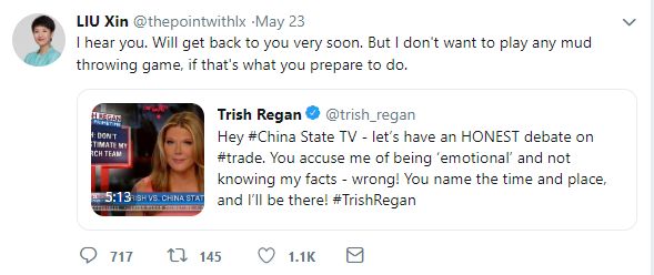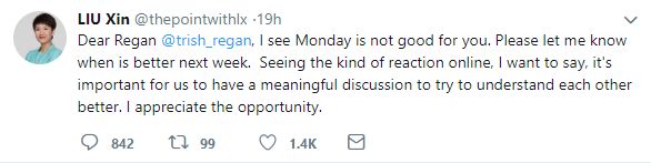 刘欣在推特上回复Trish Regan:“I hear you. Will get back to you very soon. But I don't want to play any mud throwing game, if that's what you prepare to do.(我明白了。 很快就会给你回电话。 但是我不想玩扔泥巴的游戏,如果你准备这么做的话。)”